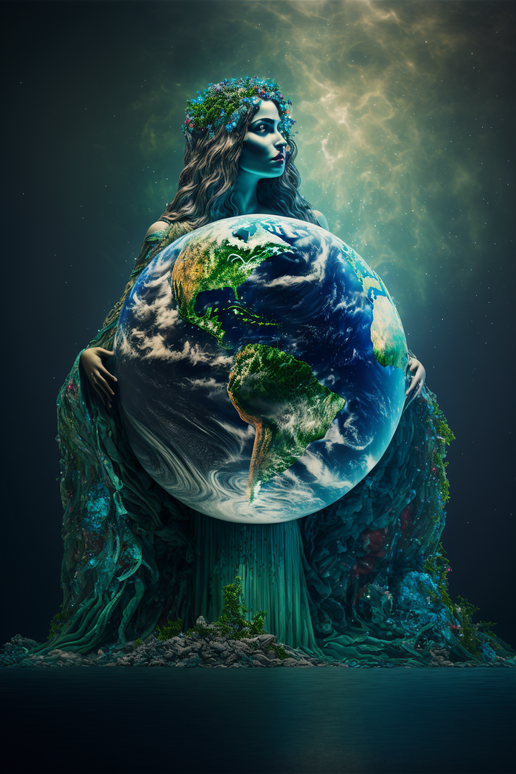 The artwork depicts Gaia, the Mother of Earth, as a powerful and majestic woman with long flowing hair that cascades down her back. Her face radiates with a serene and peaceful expression as she cradles the earth in her arms, symbolizing her protective and nurturing role over the planet and all the living things that inhabit it.